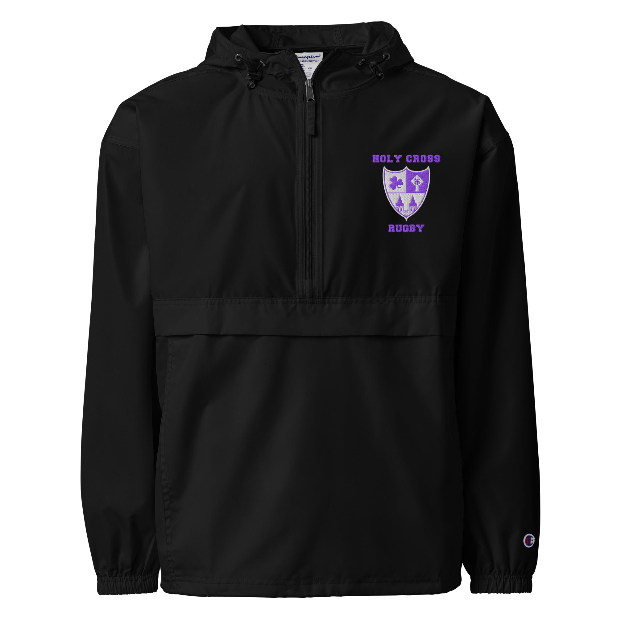 Protect yourself from the elements with a Champion packable jacket, customized for Holy Cross Rugby Football Club. This wind and rain resistant polyester jacket with a detailed embroidery design has a practical hood, front kangaroo pocket, and zipped pouch pocket which you can pull out and use to scrunch the jacket into for convenient storage.