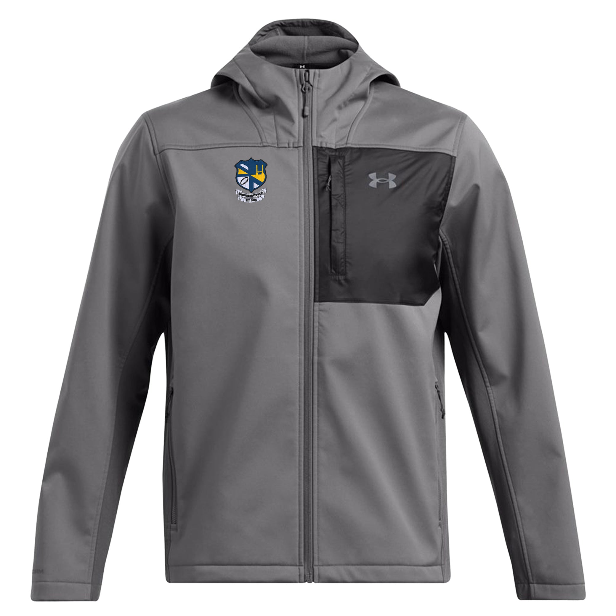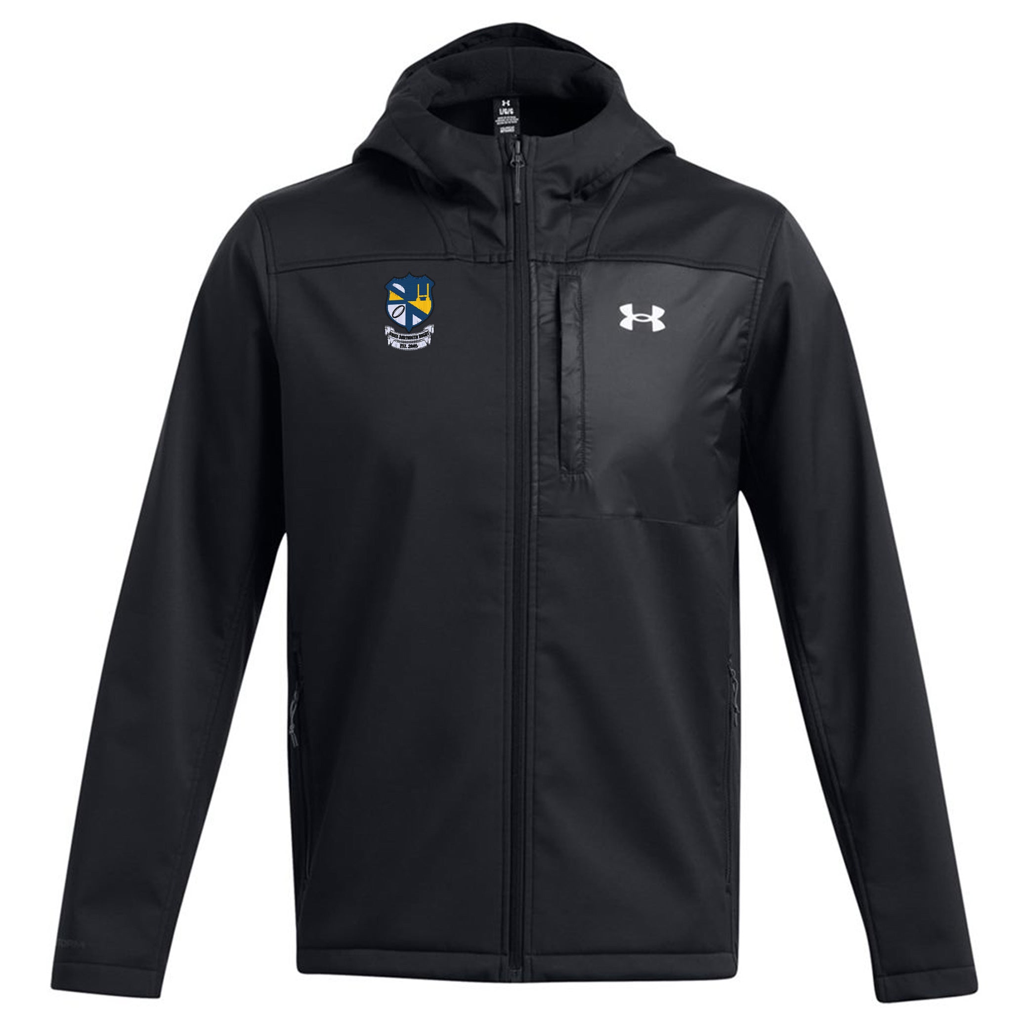 Under Armour ColdGear® Infrared Shield 2.0 Hooded Jacket, customized for UMass Dartmouth Rugby Club. A men's fit 3-layer softshell jacket designed to keep you warm and dry no matter the weather.