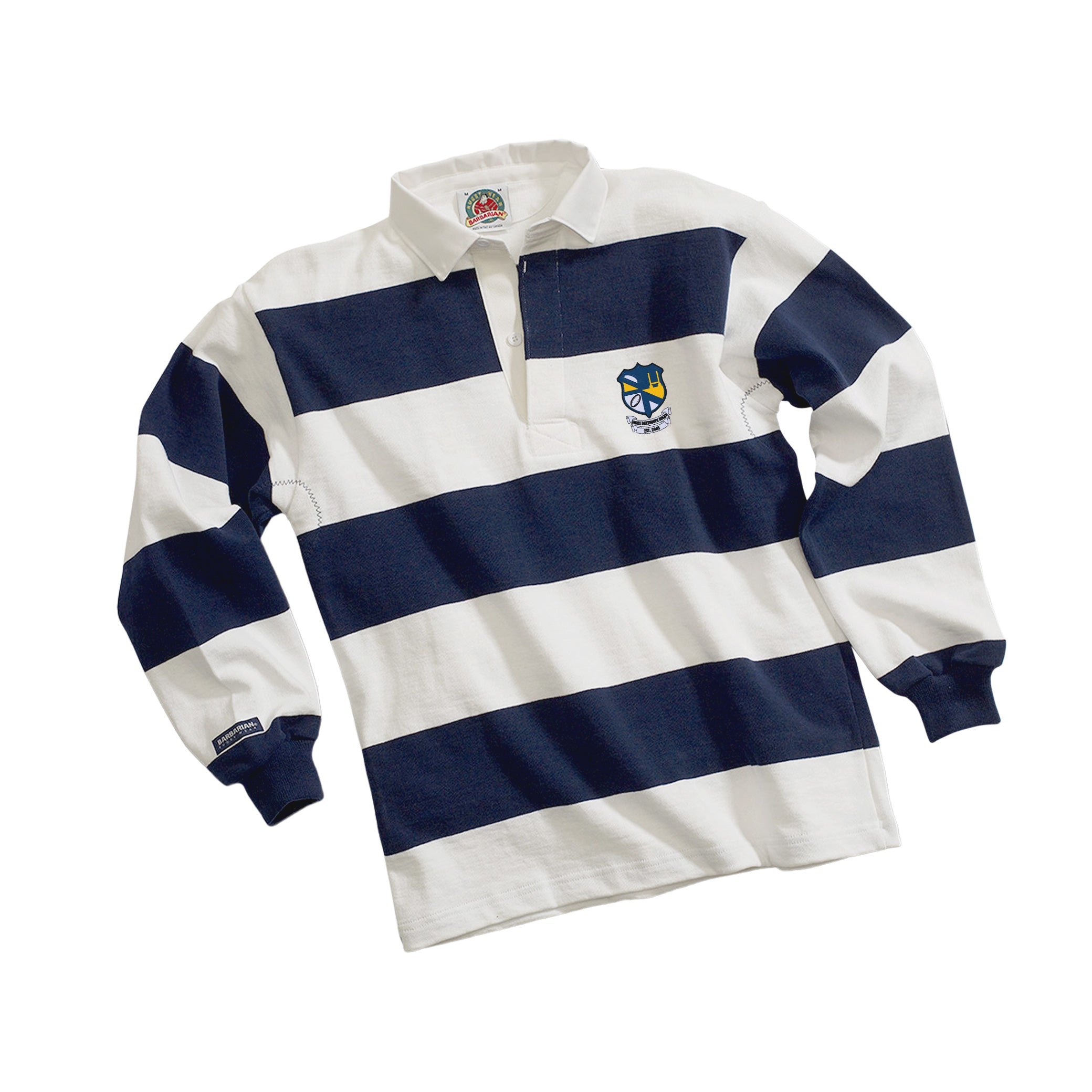 Traditional 4-inch stripe rugby jersey, customized for UMass Dartmouth Rugby Club. This striped shirt is made of the finest quality 12 oz knit cotton and made to authentic game-day specifications by Barbarian.